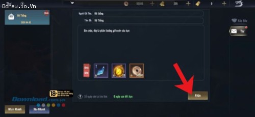 Bước 7: Cuối cùng, tại hòm thư Hệ thống, chạm vào nút Nhận, để thu thập các trang bị, tiền vàng,... về cho nhân vật.