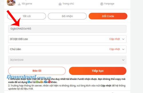 Bước 3: Khi này chúng ta kiểm tra thông tin tài khoản, sau đó hãy nhập mã code ở phía bên trên, rồi ấn vào nút Tiếp tục.