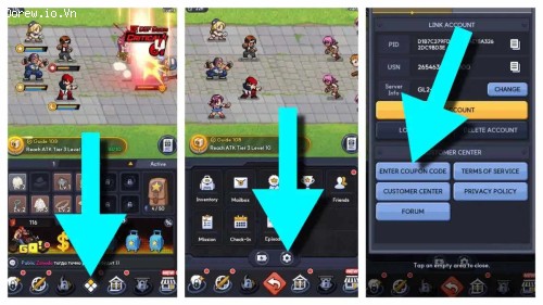 - ⋆ Khởi động trò chơi The King of Fighters AFK trên thiết bị của bạn.[] Nhấn vào nút bốn ô vuông ở cuối màn hình.[] Nhấn vào nút bánh răng để mở Settings.[] Nhấn vào nút Enter Coupon Code.[] Dán mã vào ô văn bản.[] Nhấn nút Use và chọn Confirm.[] Nhận phần thưởng của bạn trong Mailbox.