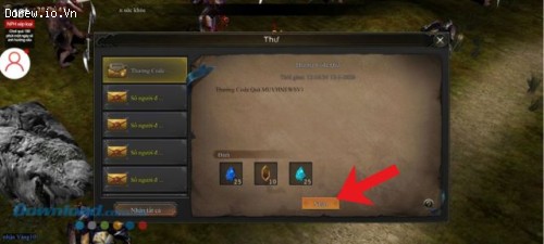 Bước 6: Ở phần thư Thưởng code, sẽ hiển thị những phần hấp dẫn mà mình nhận được khi đổi mã code, hãy ấn vào nút Nhận.